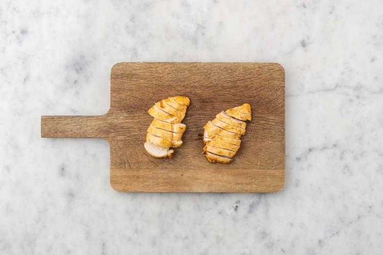 Pouletbrust nach der Garzeit aus dem Ofen nehmen und in 1 cm breite Streifen schneiden.