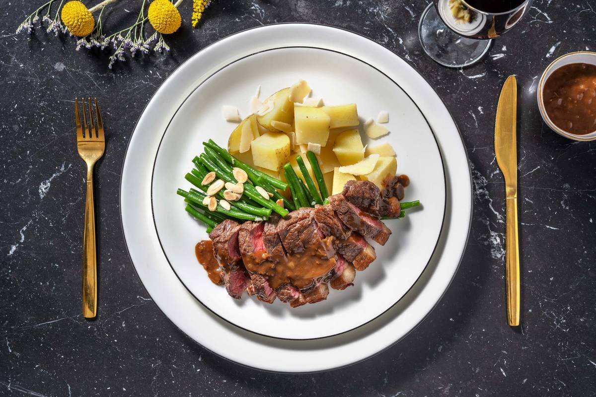 Kartoffeln, Bohnen und Steaks auf Tellern anrichten. Käse über die Kartoffeln verteilen, Mandeln über die Bohnen streuen und die Soße dazureichen.