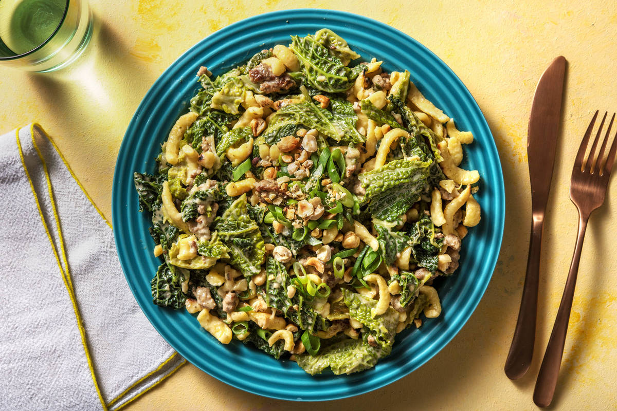 Gebratene Spätzle unter die Soße heben. Nach Geschmack mit Salz* und Pfeffer* würzen. Spätzlepfanne auf Teller verteilen, mit gehackten Haselnüssen und grünen Frühlingszwiebelringen bestreuen und genießen.