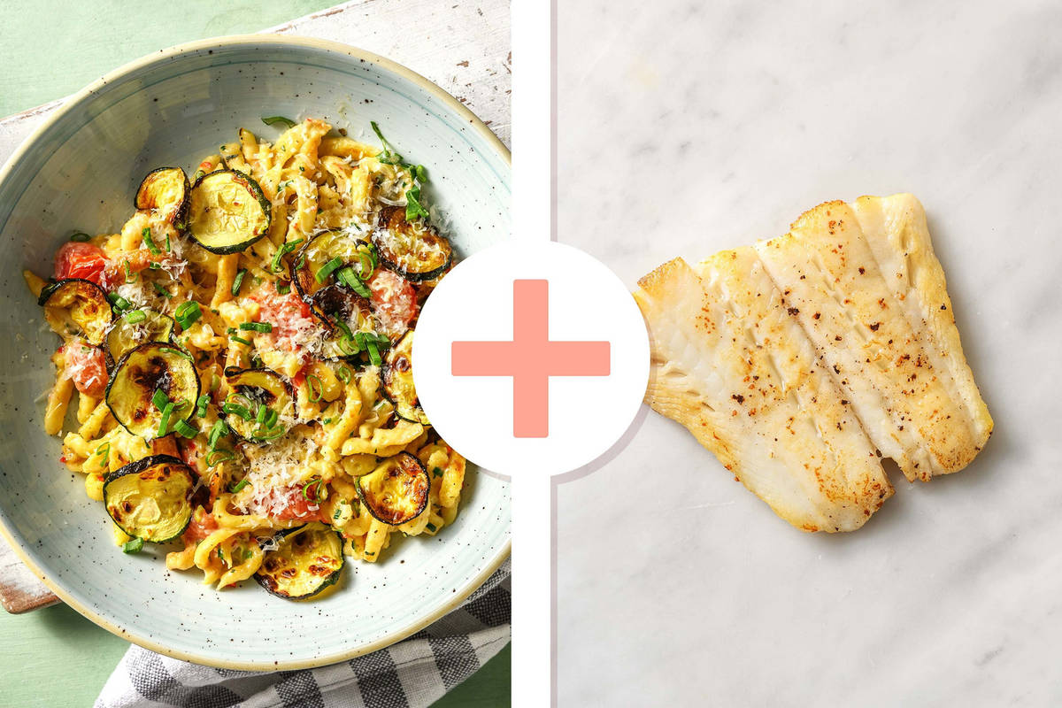 Spätzle mit dem Sahnemix ablöschen und noch ca. 2 Min. köcheln lassen. Nach der Varoma Garzeit, Varoma abnehmen, halbierte Kirschtomaten und Zucchini in die Pfanne zugeben und unterheben. Prüfen ob der Fisch gar ist, eventuell den Varoma noch mal aufsetzen und 5 Min./Varoma/Stufe 1 nachgaren. Darauf achten, dass alles gleichmäßig heiß ist. Spätzlepfanne mit Salz* und Pfeffer* abschmecken.