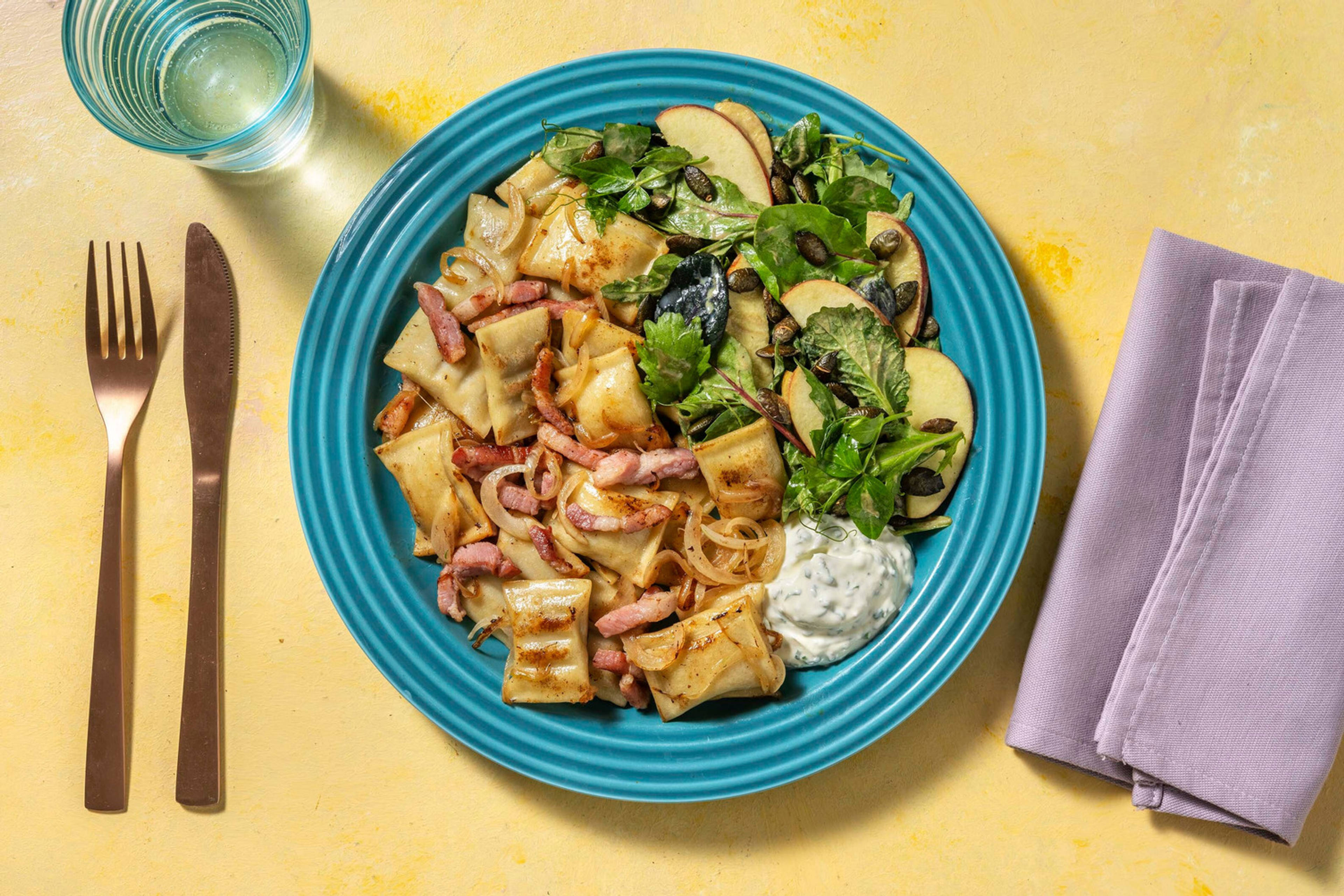 Spätzlipfanne einmal durchrühren, auf Teller verteilen und mit grünen Frühlingszwiebelringen toppen. Mit Salat geniessen.