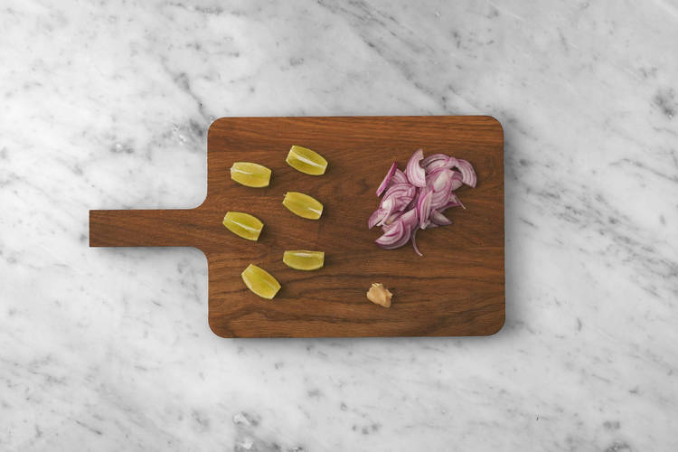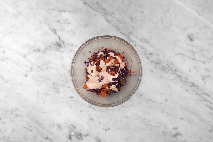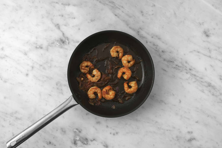 Rotkohlsalat und Teriyaki-Garnelen darüber verteilen und mit der grünen Chili garnieren.