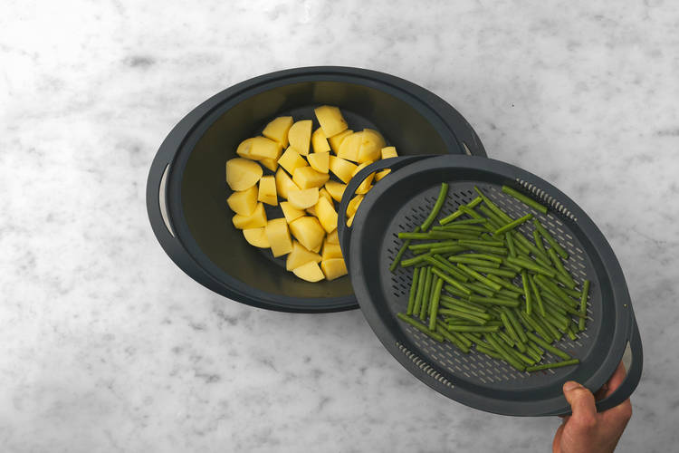 mit knusprigen Kartoffelwürfeln und grünen Bohnen