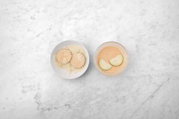 in Panko-Mandel-Panade, dazu Drillinge und Bohnen