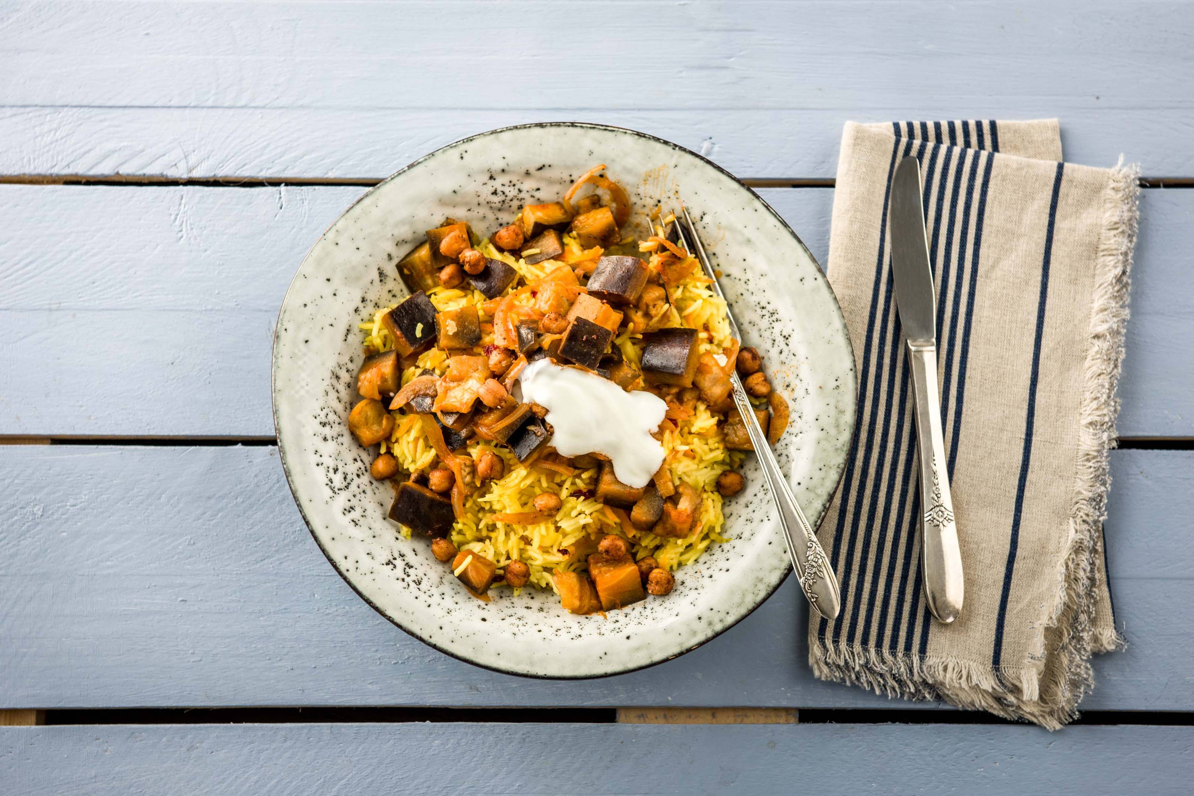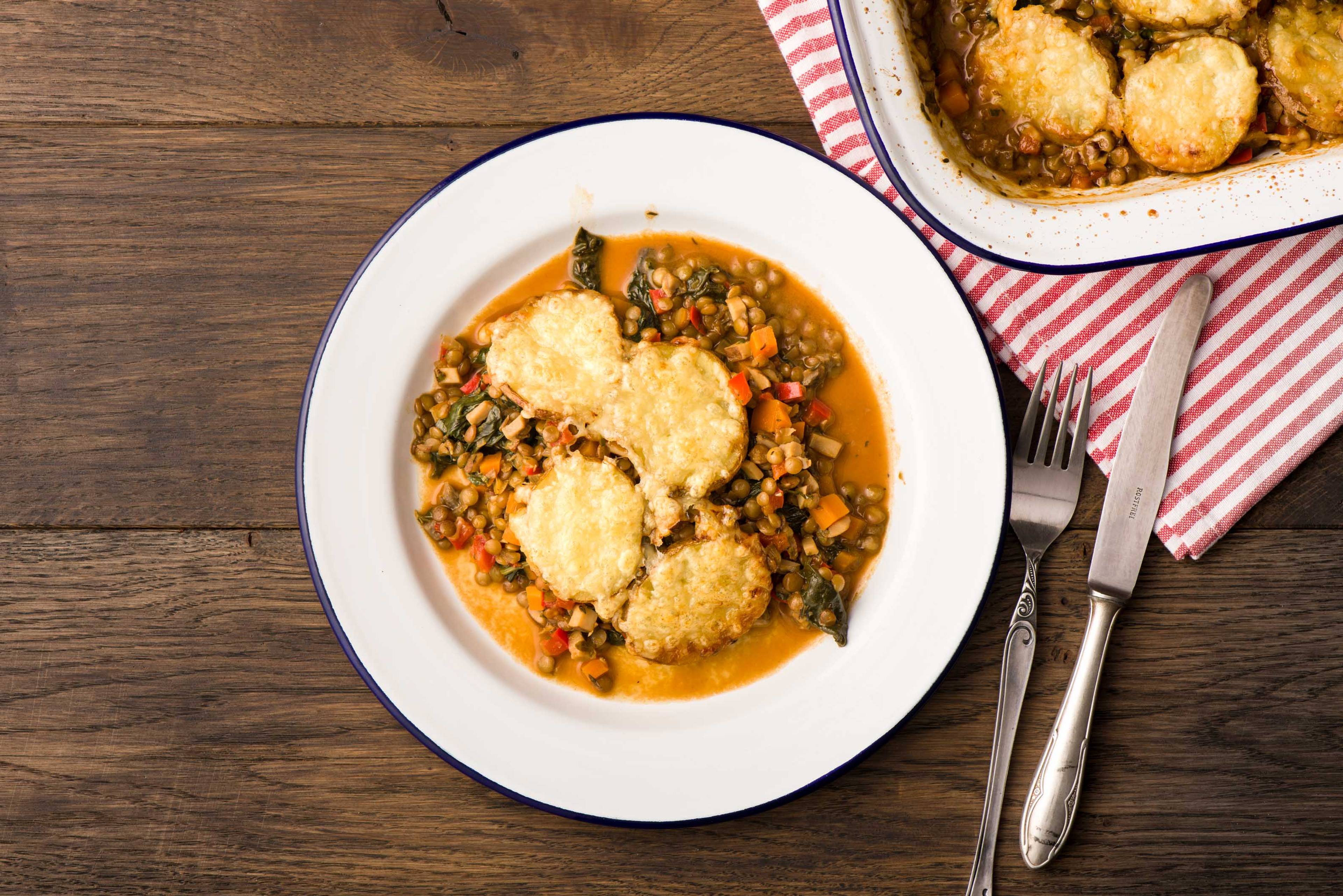 Vegetarisches Moussaka auf Teller verteilen und mit dem Salat geniessen.