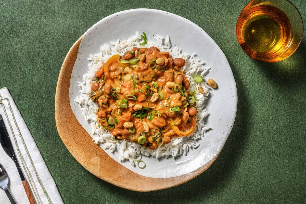 Gemüse aus dem Varoma und Babyspinat in den Topf zur Soße geben, unterheben und weitere 2 - 3 Min. köcheln lassen. Eintopf mit geräuchertem Paprikapulver, Salz* und Pfeffer* abschmecken. TIPP: Falls der Eintopf zu dickflüssig wirkt, füge etwas Garflüssigkeit hinzu. Währenddessen Erdnüsse grob hacken. Weiße Frühlingszwiebeln zum Reis geben, mit einer Gabel unterheben und dabei den Reis auflockern.