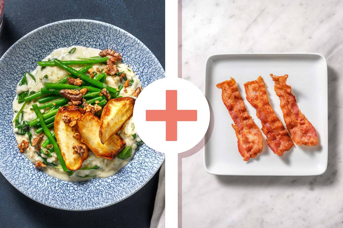 Das Risotto auf tiefen Tellern verteilen, Bohnen daneben anrichten und mit den gebackenen Birnen und Walnüssen toppen. Guten Appetit!